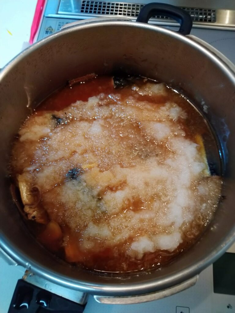 今季初、圧力鍋で骨まで柔らかく煮込みました。